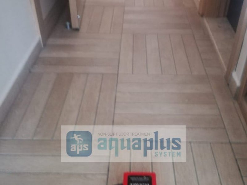 Yüzey çeşidine (seramik, doğal taş, fayans, granit, mozaik, mermer, vb) ve kullanım alanına (ıslak-yağlı, mutfak, banyo, havuz kenarı) göre çeşitli oranlarda hazırlanan solüsyon karışımı, zemine püskürtülür, eşit şekilde yumuşak bir fırça ile bastırmadan yüzeye dağıtılır ve süre tutulur. Süre, solüsyonun zeminle olan tepkimesine göre değişkenlik gösterir. Baz alınan süre boyunca Aqua Plus solüsyonunun kurumaması önemlidir. Erken kuruması uygulamanın etkisiz olmasına neden olur. Kurumaya engel olmak için, 30 ila 60 dakika arasında değişen uygulama süresi boyunca fırça ile ara sıra zemin fırçalanır. Kuruma hızlanırsa tekrar ilaç püskürtülerek kuruma engellenir. Belirlenen sürenin dolması sonrasında zemin su ile yıkanarak uygulama durdurulur ve solüsyon yüzeyden tamamen arındırılır. Uygulama sonunda tekrar SCOF Metre cihazı yardımıyla ölçüm alınarak ''AB Standartlarına'',''TSE Standartlarına'',''Erişebilirlik Kanunu'' ve ''İş Güvenlik Kanunu''na getirildiğinin tespit edilmesinin ardından işlem tamamlanmış olur. Aqua Plus ile yapılan bu uygulama sonunda riskli zeminler kaymaz zemin haline dönüşerek standartlara ve kanunlara uygun hale gelecektir.